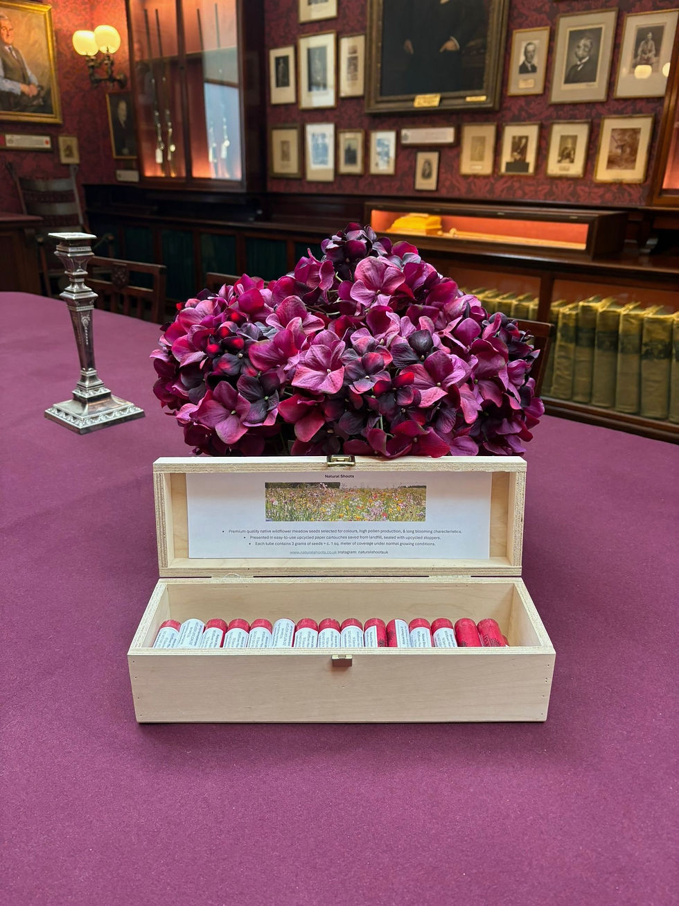 Thanks to Natural Shoots' innovative upcycling network, spent Purdey cases were methodically diverted from landfill and stored ready for re-use. The next step? Giving them a second life, filled not with shot, but with fully traceable UK-native wildflower seed mix that can be planted in pots, patios, orchards, and gardens. Annual wildflower seeds, perennial seeds, and yellow rattle are all present in the specially selected mix.